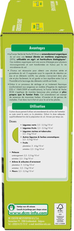 DCM Gedroogde Koemest is een bodemverbeteraar die de grond verrijkt met humus voor een betere structuur. Het is een gedroogd product, vrij van onkruidzaden, ziektekiemen en insecten en dus volledig veilig voor grond en planten. Gebruiksvriendelijker en schoner dan verse mest. Dosering 2,5 - 3,5 kg per 10 m². Toepasbaar in de biotuin.